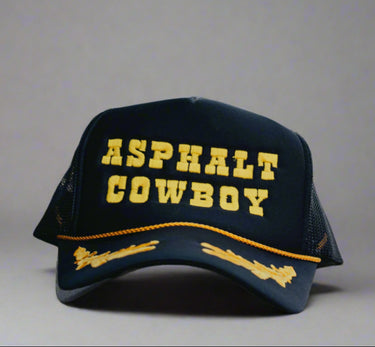 The Asphalt Cowboy Trucker Hat is an ode to the spirit of the open road. Featuring a black foam front with "Asphalt Cowboy" embroidery, this hat blends rugged style with bold gold accents. With a breathable mesh back and adjustable snapback, it’s the perfect mix of comfort, style, and tribute to the trucker lifestyle.