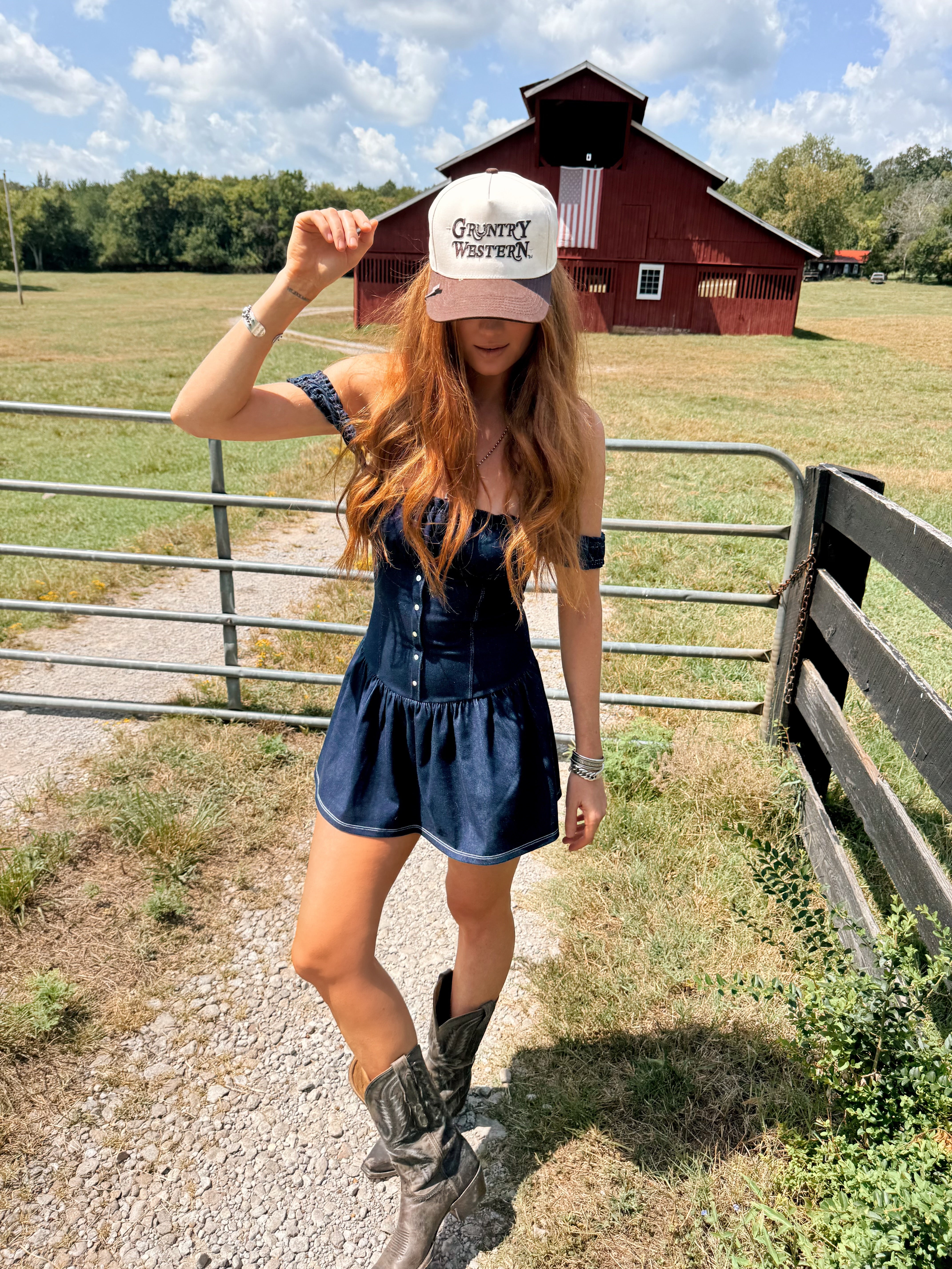 KATE SYKES GRUNTRY WESTERN TRUCKER HAT ON BOOTS