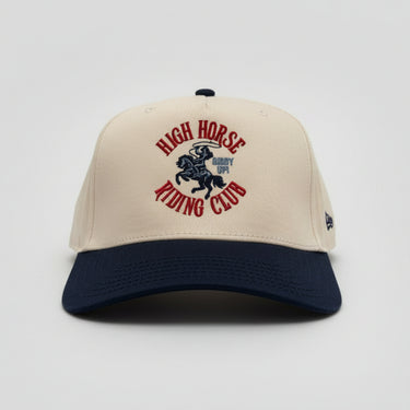 The High Horse Riding Club hat features a natural crown, navy brim, and a clean embroidered design that blends classic style with an elevated edge. Complete with an adjustable snapback for all-day comfort—made for those who like to ride a little higher.